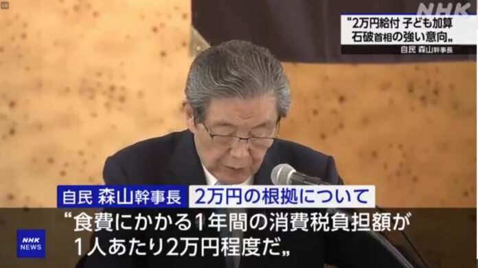 O Secretário-Geral do PLD, Moriyama, proferiu um discurso na cidade de Kagoshima no dia 14, explicando a base para os 20.000 ienes, afirmando: “A carga anual do imposto sobre o consumo de alimentos é de cerca de 20.000 ienes por pessoa”.